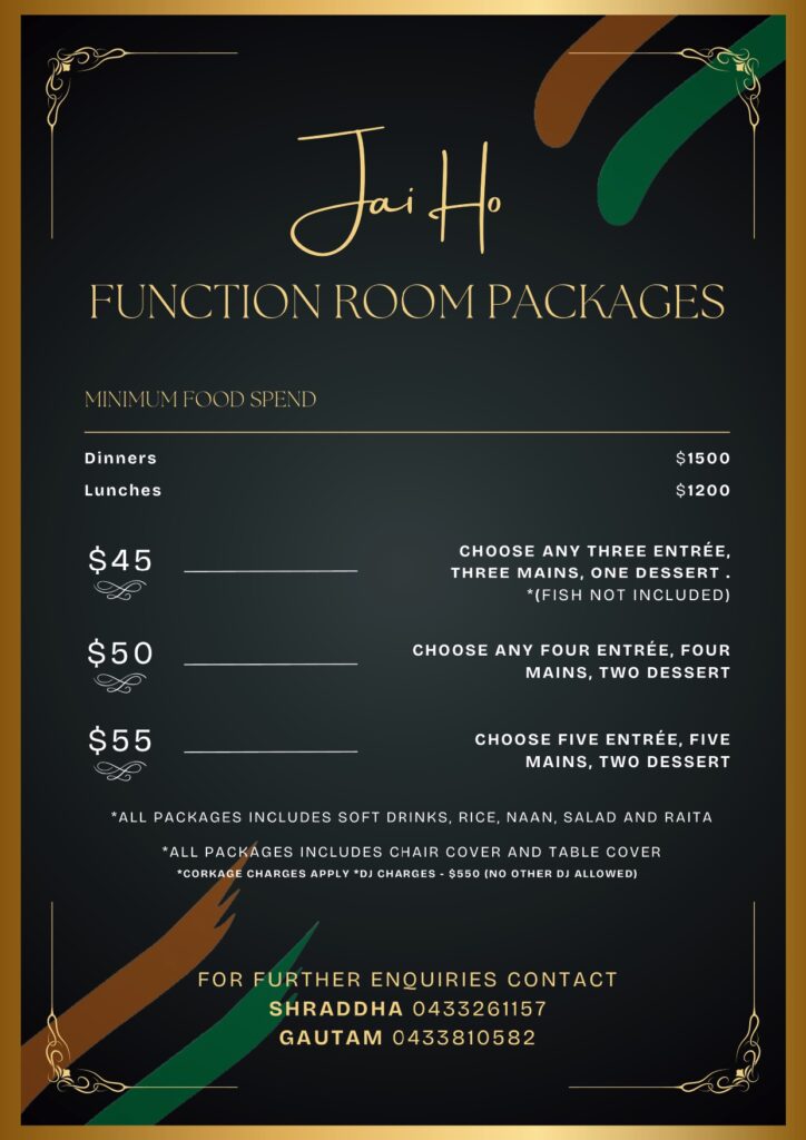 Let Jai Ho transform your next gathering into an unforgettable experience. Contact us today to discuss your specific needs and make a reservation for our Functions Room. We look forward to celebrating with you!